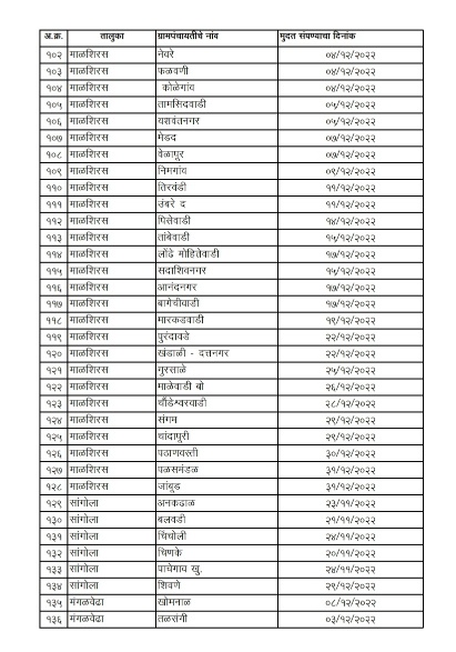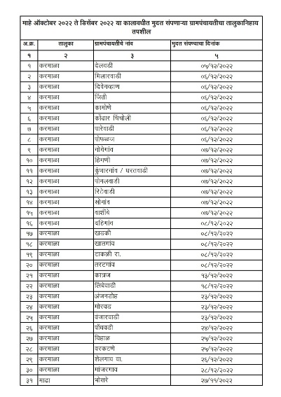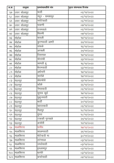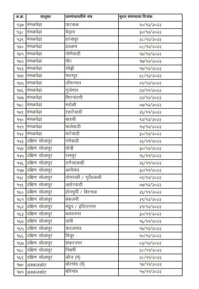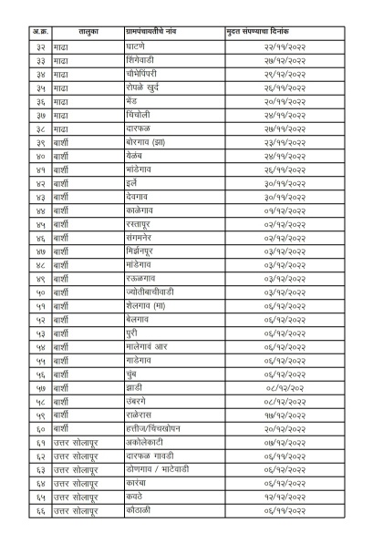 ऑक्टोबर ते डिसेंबर 2022 या कालावधीत मुदत संपणाऱ्या ग्रामपंचायतीमध्ये अक्कलकोट तालुक्यातील 20, बार्शी 22, करमाळा 30, माढा 8, माळशिरस 35, मंगळवेढा 18, मोहोळ 10, उत्तर सोलापूर 12, पंढरपूर 11, सांगोला 6 आणि दक्षिण सोलापूर 17 अशा एकूण 189 ग्रामपंचायतींचा समावेश आहे.