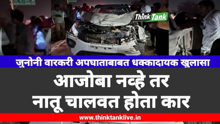 Spread the love थिंक टँक : विशेष प्रतिनिधी सांगली – सोलापूर राष्ट्रीय महामार्गावरील जुनोनी (ता. सांगोला) गावाजवळ दोन दिवसांपूर्वी वारकऱ्यांच्या दिंडीत कार घुसून सात वारकऱ्यांचा मृत्यु झाला होता. या भीषण अपघाताबाबत धक्कादायक माहिती समोर आली आहे. या अपघातातील कार हा आजोबा नव्हे तर नातू चालवत चालवत असल्याचे समोर आले आहे. विशेष म्हणजे त्याला कार कशी … Continue reading जुनोनी वारकरी अपघाताबाबत धक्कादायक खुलासा; आजोबा नव्हे तर नातू चालवत होता कार