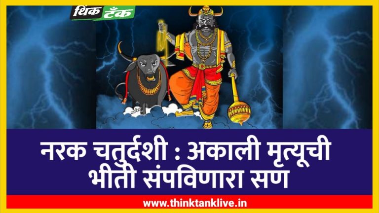 Spread the love थिंक टँक / नाना हालंगडे हिंदू मान्यतेनुसार, दिवाळी पर्वात साजरा होणाऱ्या नरक चतुर्दशीला विशेष महत्त्व आहे. या दिवशी तर्पण आणि दीपदान करण्याची प्रथा आहे. या दिवशी सकाळी अभ्यंग स्नान करून यमराजाची पूजा केली जाते. मान्यतेनुसार, असे केल्याने व्यक्तीची सर्व पापांपासून मुक्ती होत त्याला स्वर्गप्राप्ती होते. संध्याकाळी यमाची पूजा करत दिवा लावण्याची प्रथा … Continue reading नरक चतुर्दशी : अकाली मृत्यूची भीती संपविणारा सण