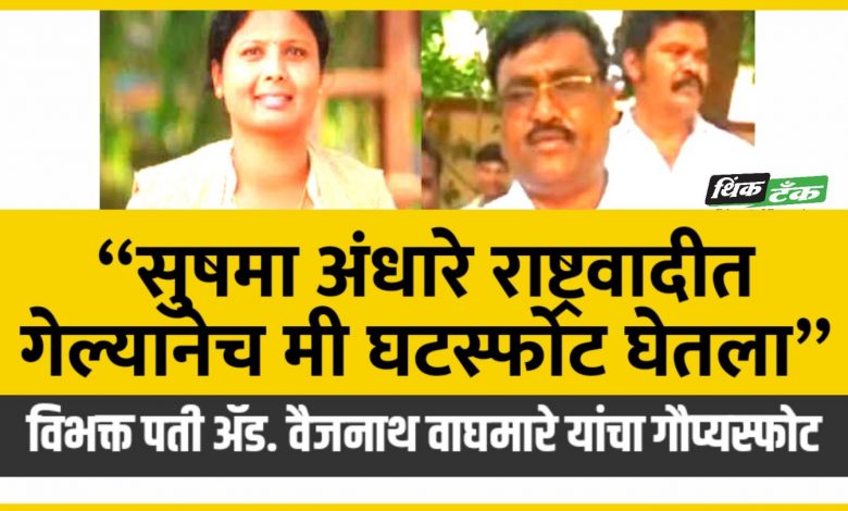 “सुषमा अंधारे या राष्ट्रवादीत गेल्याची बाब मला खटकली. त्यांना मला नेता बनवायचे होते. मात्र त्यांनी राष्ट्रवादीत जाऊन चूक केली. याच कारणावरून मी त्यांच्याशी घटस्फोट घेतला आहे. आम्ही पाच वर्षांपासून विभक्त आहोत. त्यांना त्यांचा मार्ग मोकळा आहे.” सुषमा अंधारे यांनी आजपर्यंत केलेल्या वक्तव्याचा येत्या चार दिवसांत पत्रकार परिषद घेऊन खुलासा करणार असल्याची खळबळजनक घोषणा सुषमा अंधारे यांचे विभक्त पती ॲड. वैजनाथ वाघमारे यांनी प्रसार माध्यमांशी बोलताना केली.