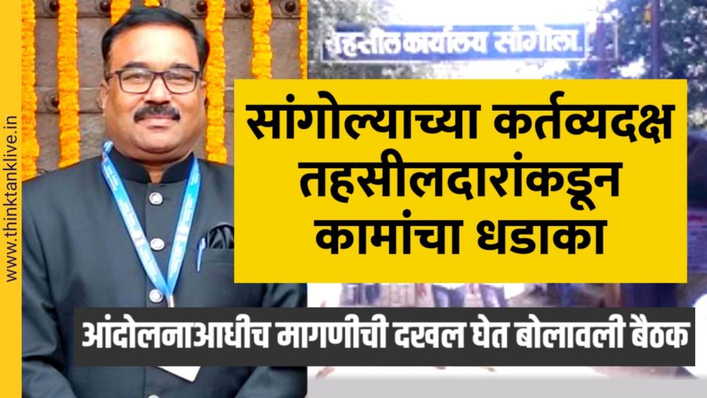 Spread the love थिंक टँक न्यूज नेटवर्क : नाना हालंगडे सांगोला तहसील कार्यालयाचे कर्तव्यदक्ष तहसीलदार संजय खडतरे यांनी तहसीलदार पदाचा पदभार स्वीकारल्यापासून कामांचा धडाका लावला आहे. एका सामाजिक संघटनेने पुकारलेल्या आंदोलनाची तातडीने दखल घेत बैठक आयोजित करून आपल्या संवेदनशीलतेने दर्शन घडविले आहे. (Sangola Tahasildar Sanjay Khadtare) स्वाभिमानी होलार समाज संघटना (Swabhimani Holar Samaj Sanghatana) तसेच … Continue reading सांगोल्याच्या कर्तव्यदक्ष तहसीलदारांकडून कामांचा धडाका